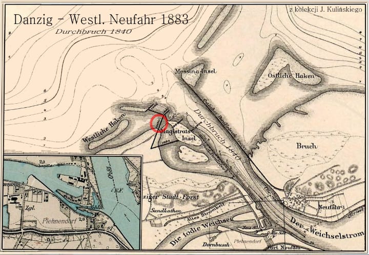 Badania kartograficzne i archiwalne obalają ten mit. Przed powodzią z 1840 roku po zachodniej stronie Wisły Śmiałej nie istniały żadne zabudowania Neufahr. Były tam jedynie łąki i nieużytki.